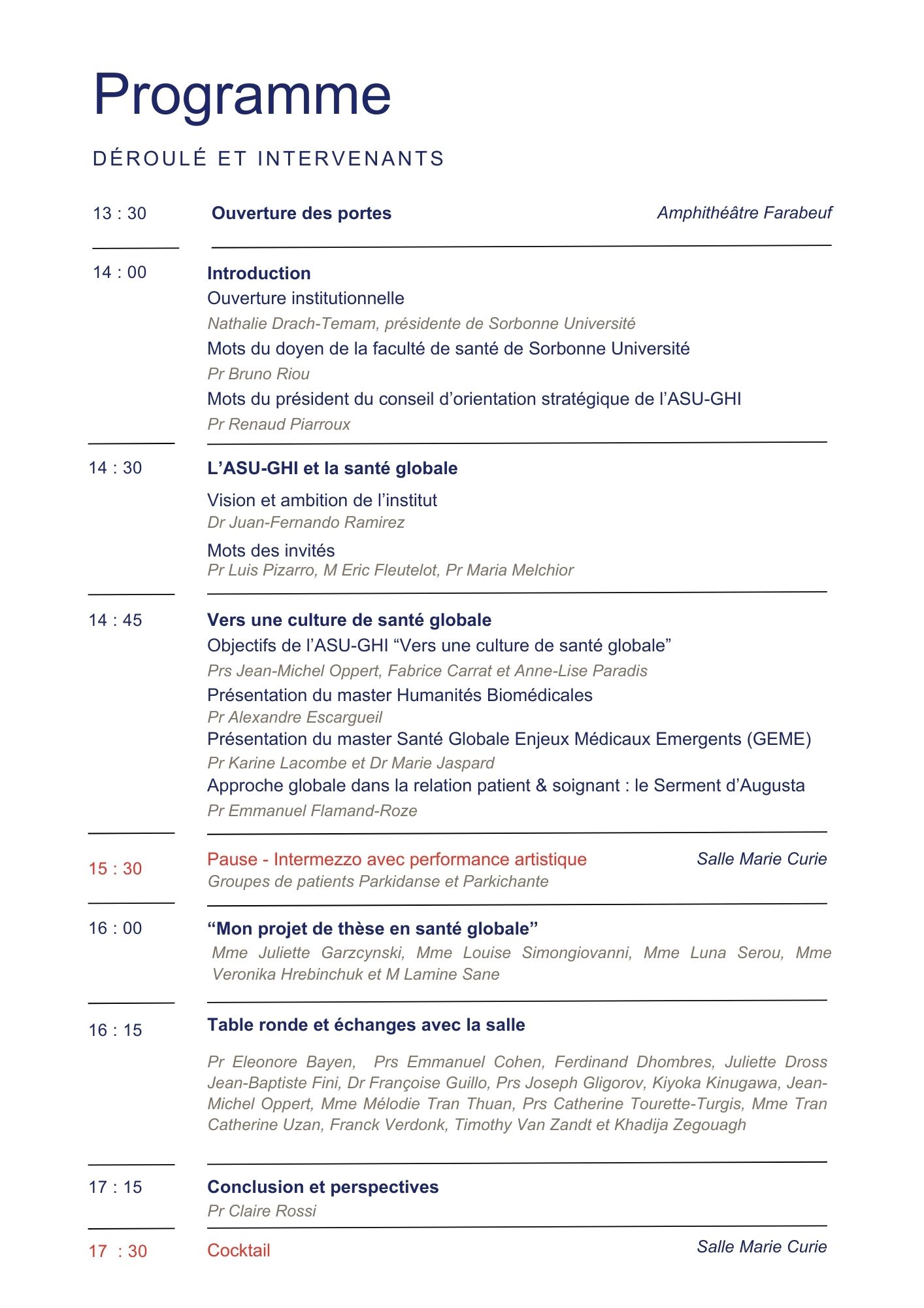Le séminaire permettra également d’ouvrir un espace d’échanges sur les collaborations en cours et à venir, et sur la manière dont l’ASU-GHI entend contribuer à améliorer l’accès aux soins, la prévention et l’équité en santé au sein de l’Alliance Sorbonne Université et avec ses partenaires nationaux et internationaux.